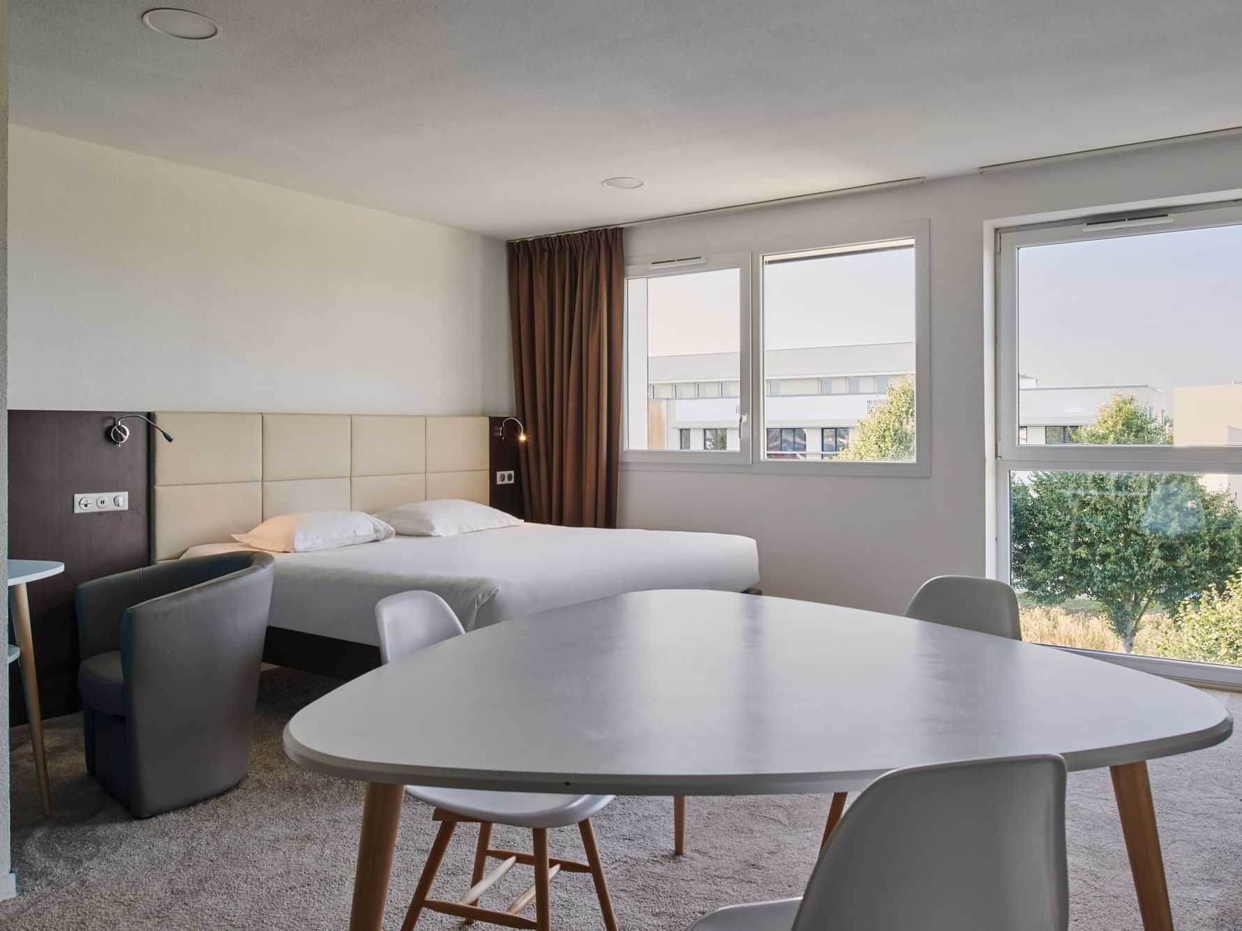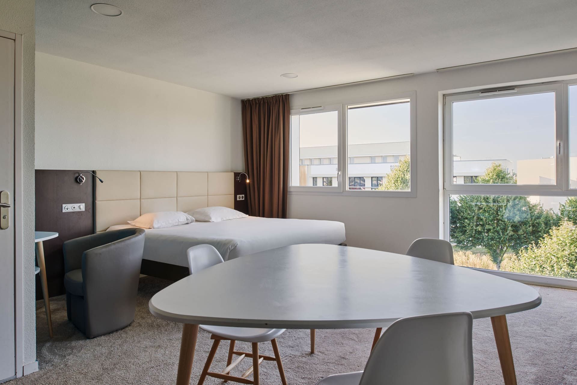 Surface totale de 21m² climatisation réversible à réglage individuel, TV de 40’’ à écran plat. Salle de bain équipée pour PMR d’une douche à l’italienne adaptée, d’un sèche-cheveux, d’un porte serviettes chauffant et de toilette.